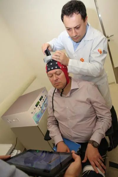 Transcranial Magnetic Stimulation (TMS) is a technique that delivers a high energy magnetic pulse to the head of the patient which induces an electrical current in the brain tissue. When stimulating at for example the motor cortex the activation of the corresponding muscles can be monitored by measuring its EMG response. In order to investigate the effect of the TMS pulse in the brain, EEG can be measured simultaneously. (Rossi et al. 2004) The eego sports system provides a platform to combine such measurements in mobile settings without being bound to cables, power outlets or desktop computers to store the information.