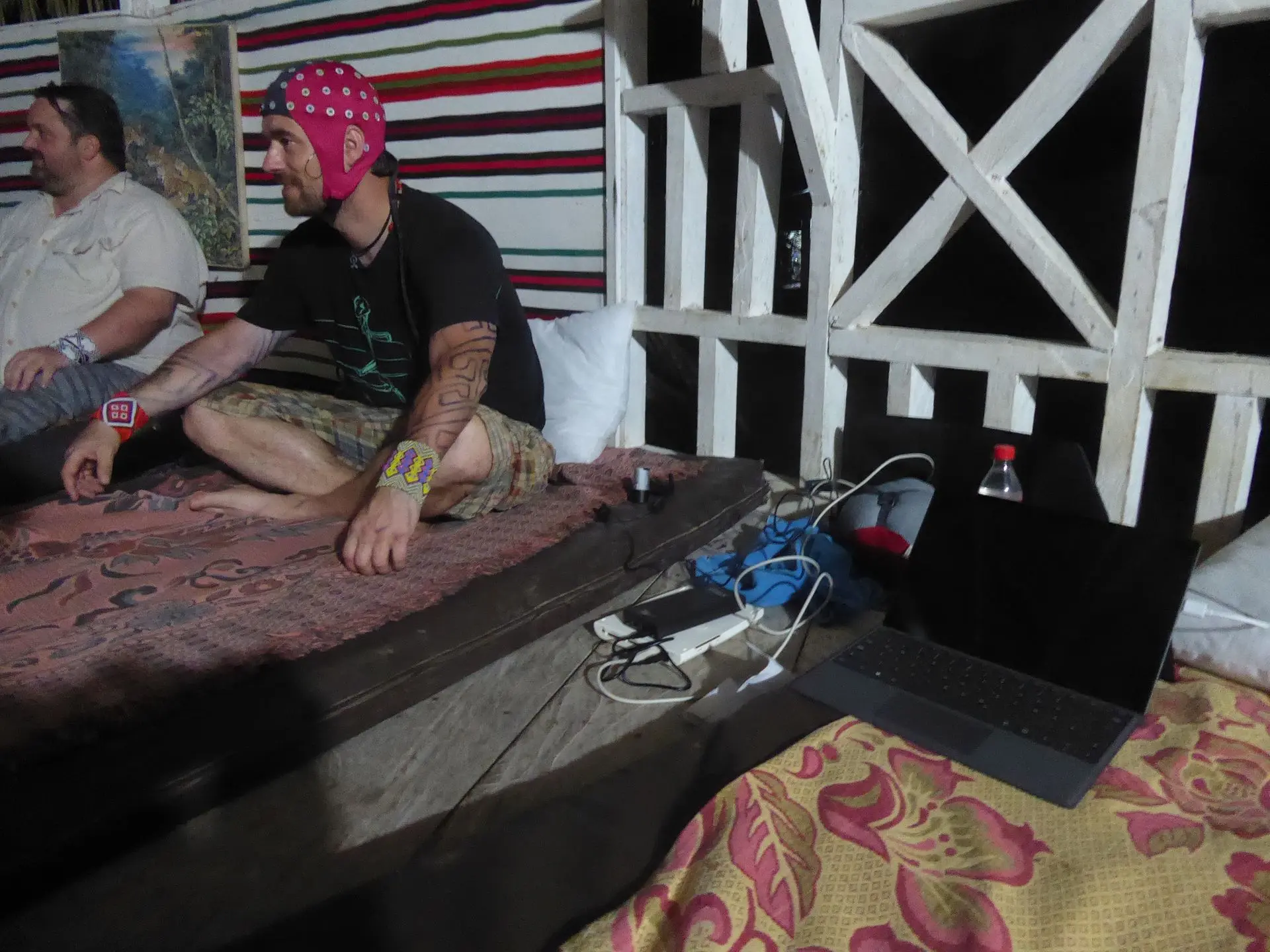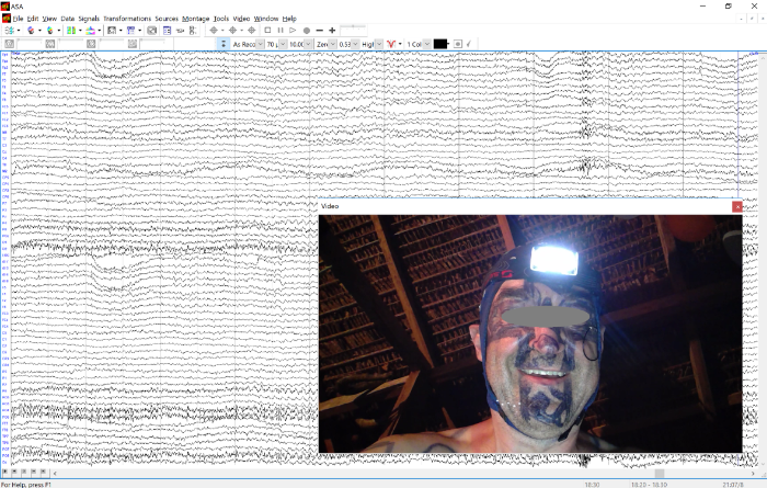 We were able to establish a good relationship with the Huni Kui people, to participate in their healing rituals and do preliminary EEG recordings on ourselves before and after having intranasal rapé and also after ingesting ayahuasca. In a context like this it is very hard to design and implement blinding with a placebo substance, which is considered the gold-standard in pharmacological studies. Yet, the striking subjective effects of both ayahuasca and rapé makes blinding very likely to be broken during the study, even in laboratory settings, which is why the repeated measures design as planned by us is a useful alternative. We recorded each individual during a baseline and then during/after the blowing of rapé or ingesting ayahuasca, in different situations. Data quality was very good, with minimal movement artifacts after a rapé blow or when the subject changed position.
