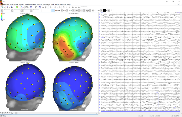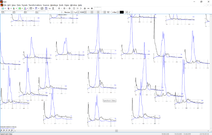 Analysis in frequency domain (asa software, ANT Neuro bv, ant-neuro.com) was carried out in one-minute epochs of the resting-state EEG. The following images give an impression of the rapid changes in the Alpha and Beta bands. Detailed and more sophisticated analysis is currently ongoing.