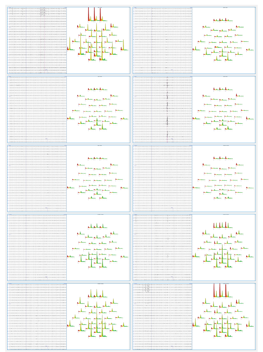 Each image shows one minute of EEG to the left (31 channels, 10-20 positions), high-pass filtered at 1 Hz and in common average montage, with 50 µV sensitivity, and FFT power per channel for the same EEG to the right, with the frequency axis going from 0.5 to 30 Hz and coloring per band (Delta in red, Theta in orange, Alpha in yellow, Beta in green), power sensitivity 1µV². The images were taken from minute 12, 22, 33, 43, 53, 63, 73, 83, 93 and 103 after intake of the substance. No other substances were used and the subject lied on the mattress, listening to the ritual singing by the maestro.