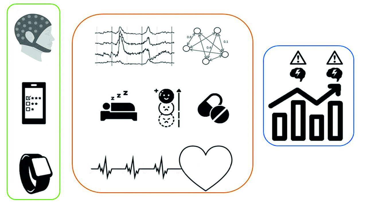 Figure 1: A diagram that summarises how the EEG@HOME study works. The left part of the diagram contains icons that represent how measurements are taken: via EEG cap (ANT Neuro 8 channel waveguard™ touch dry EEG cap), smartphone app (SeerMedical) and smartwatch (FitBit Charge4). The middle part of the diagram contains icons representing the different measurements recorded: scalp EEG, heart rate, seizure occurrence, medication taken, sleep quality, stress and mood. The right part of the diagram finally represents the aim of the study; using all the information collected to prospectively identify periods of higher seizure risk and to improve the management of epilepsy.