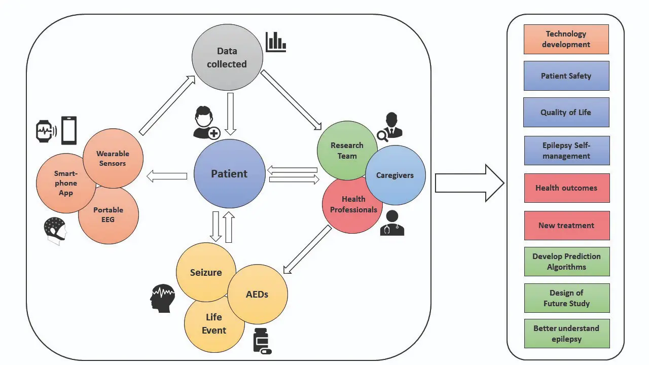 Figure 2. An eHealth model of new technology for patients with epilepsy - Every day, patients with epilepsy face the possibility of having a seizure or other stressful life events that could affect their mood, sleep and behaviour. The continuous use of wearables and e-diary to safety acquire noninvasive measurable variables that can be associated with the occurrence of their seizure will help patients in the management of their condition providing the doctor with reliable information to monitor and control their patient s therapy and improving the interaction between patients, caregivers and heath care providers. All the data collected could also allow the research teams to have reliable information for the develop of prediction algorithms and for the design of future feasible studies. (Biondi, 2021)